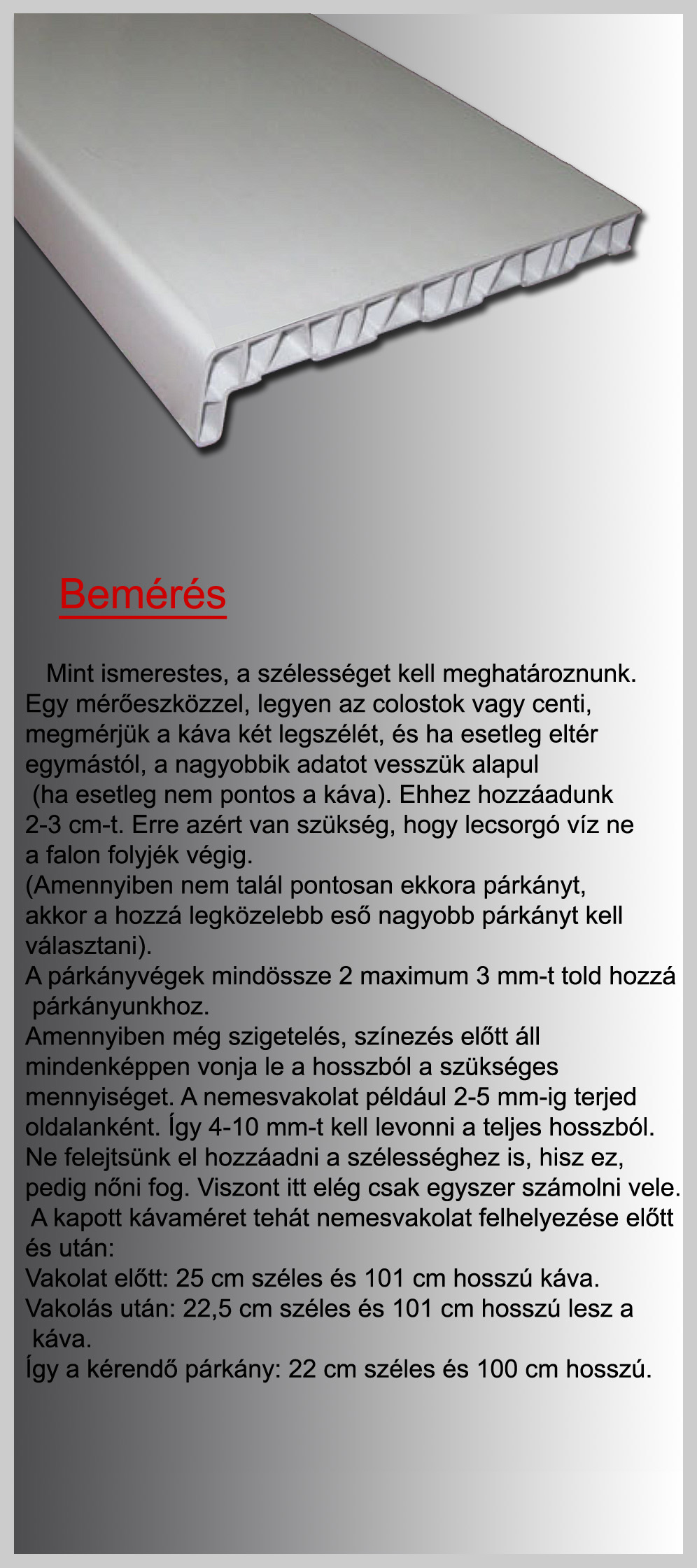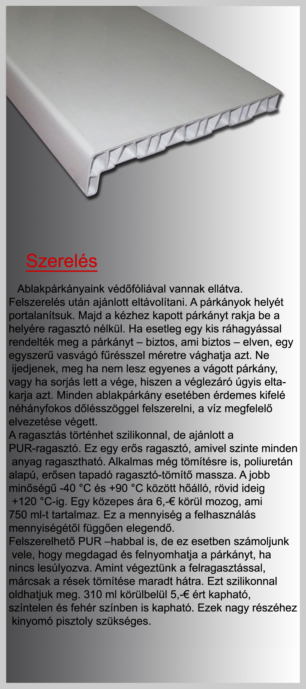Műanyag ablakpárkány, melyet német alapanyagból, speciális extrudálási technológiával gyártanak. Külsõ felületét kiváló minőségű, különféle fajtájú famintázatú RENOLIT fóliával vonják be, melyre még védőfólia kerül. 100-450 mm szélességben kínáljuk, igény szerint méretre vágva.
