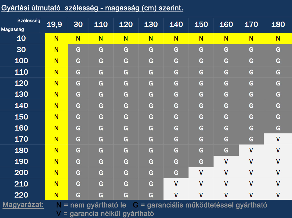 Az anyag sajátossága, hogy az 50mm-es hálószerűen átlátszó és a 75mm-es nem átlátszó szövet csíkok vízszintesen váltogatják egymást. A sávroló változtatható árnyékolását az egymás előtt mozgó két réteg eltérő pozíciója teszi lehetővé. Ha az átlátszó részek egymás mögött vannak, akkor több fényt engedhetünk be és ki is látunk az ablakon. Ha a kezelésére szolgáló gyöngylánccal úgy állítjuk az anyagot, hogy a nem átlátszó részek fedésbe kerüljenek, akkor hatásosabb árnyékolás és a betekintés elleni tökéletes védelem az eredmény. A sávroló legkisebb szélessége 30cm, míg a legnagyobb 180cm lehet. A táblázatban és a megrendelésnél szélességi méretként a szerkezetszélességet tüntetjük fel, a textil ennél 3,5 cm-rel keskenyebb. A minimális magasság 30cm és maximális 220cm lehet.